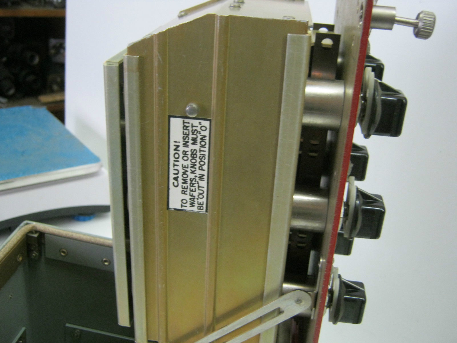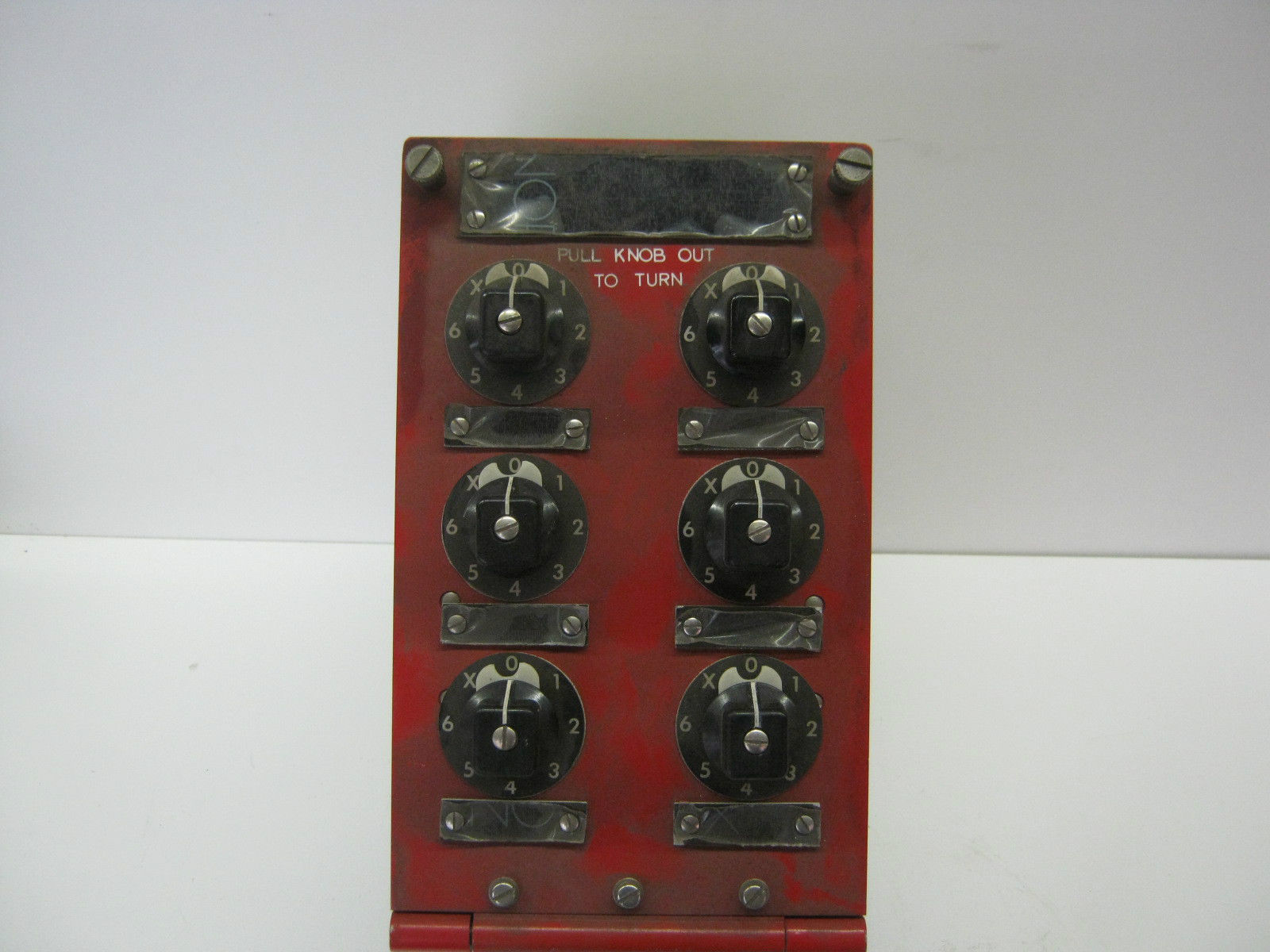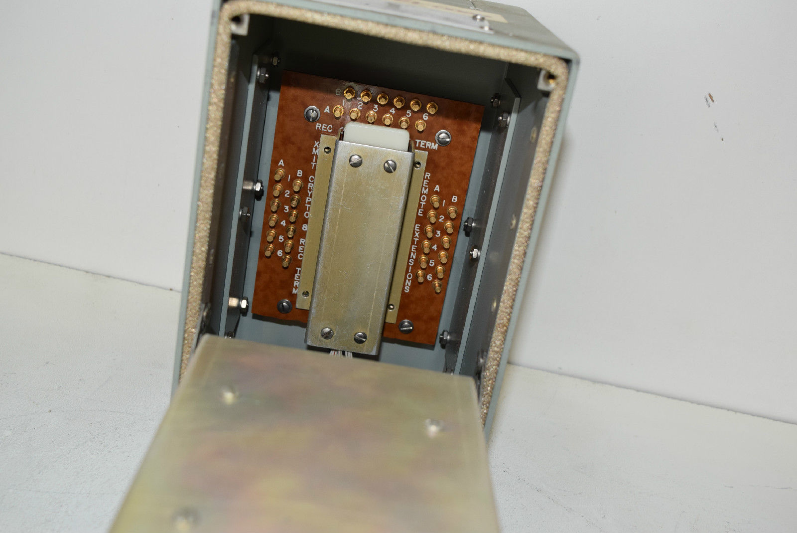SA-1794/UG Teletypewriter Switching Unit Incorporates 6 push-pull rotary switches with instantly removable wafers, low level gold plated contacts, wafers and receptacles, extension capabilities for system expansion, a completely shielded enclosure and minimum size; each unit contains six eight-position switches, mounted in two vertical rows; the positions are six active transfer positions, one extension position and an OFF position; switch position indicating device indicates both the rotary position and the IN position of the knob; when a switching matrix of more than six is desired, additional input or output (or both) devices can be added by using the extension position of the basic switch; systems of any size can be assembled with the multiple use of one basic module. | |