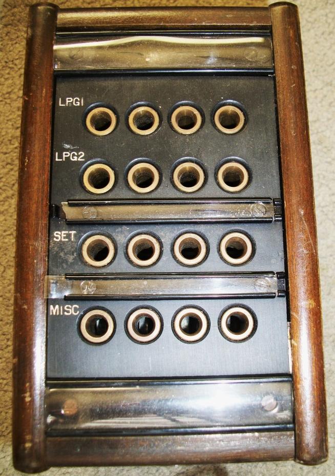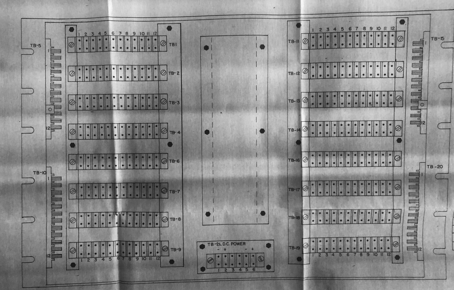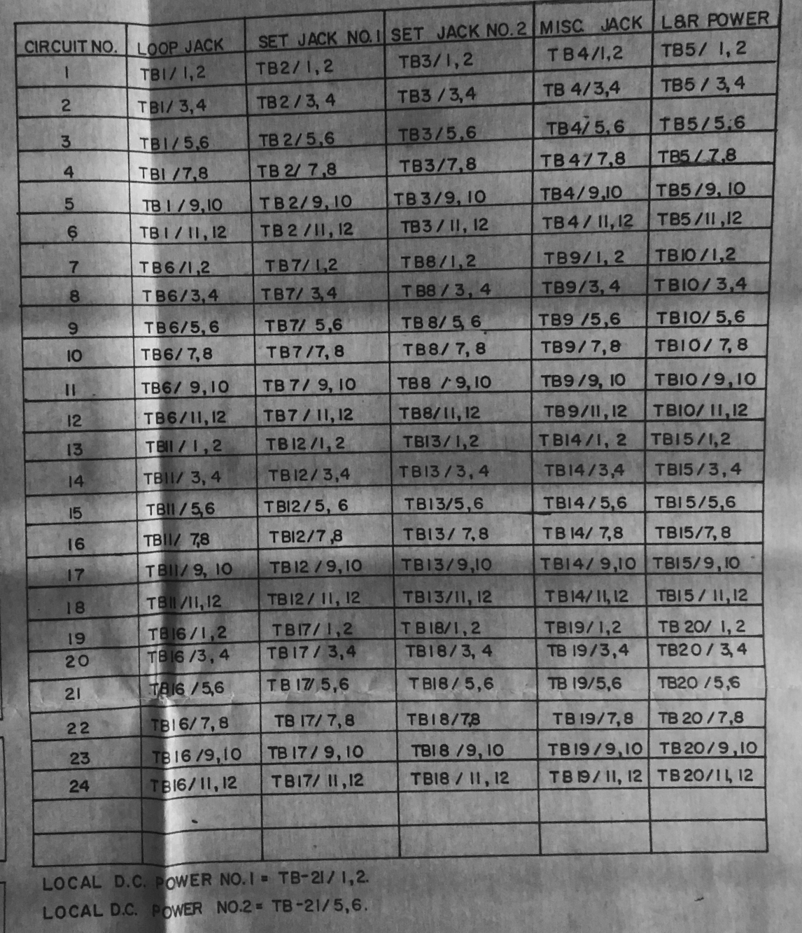 3 dual channels 2 LPG, 2 SET, 1 MISC The special patch cords are dual cords with a pin that matches the hole between the jacks - this prevents getting TTY and STEP signals crossed. Channels 1,3,5 have TTY current control and metering - Channels 2,4,6 have associated "STEP LOOP" indicators. The STEP signal releases the next character from a TD under timing control of the crypto gear. |