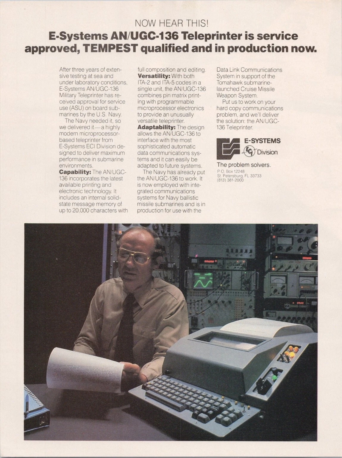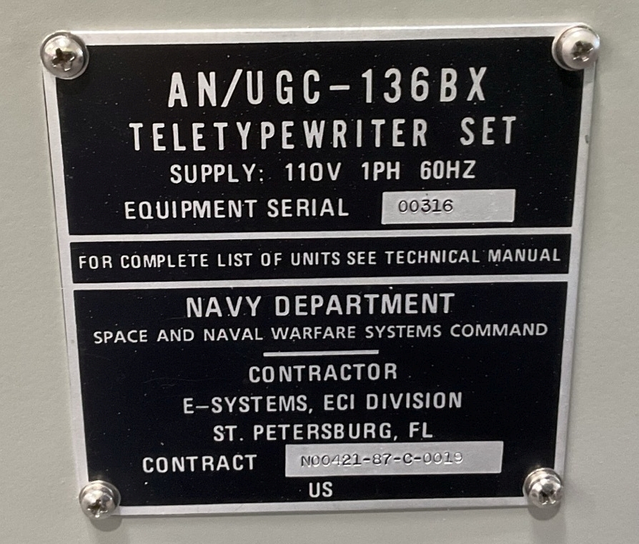 The AN/UGC-136CX is a ruggedized send-and-receive teleprinter, controlled by a microprocessor with an internal solid state memory, and full-message composition and editing capabilities; it prints data at a nominal 120 characters per second (1200 bps). It can transmit or receive at data rates from 50 to 9600 bps to or from the message storage memory, and can operate in switch-selectable Baudot or ASCII codes. The storage capacity of 64 messages or 256K random access memory (RAM), permits the short-term storage of received messages while the operator simultaneously composes and stores outgoing messages for transmission. Multiple communication ports also provide a bulk-storage device compatibility.